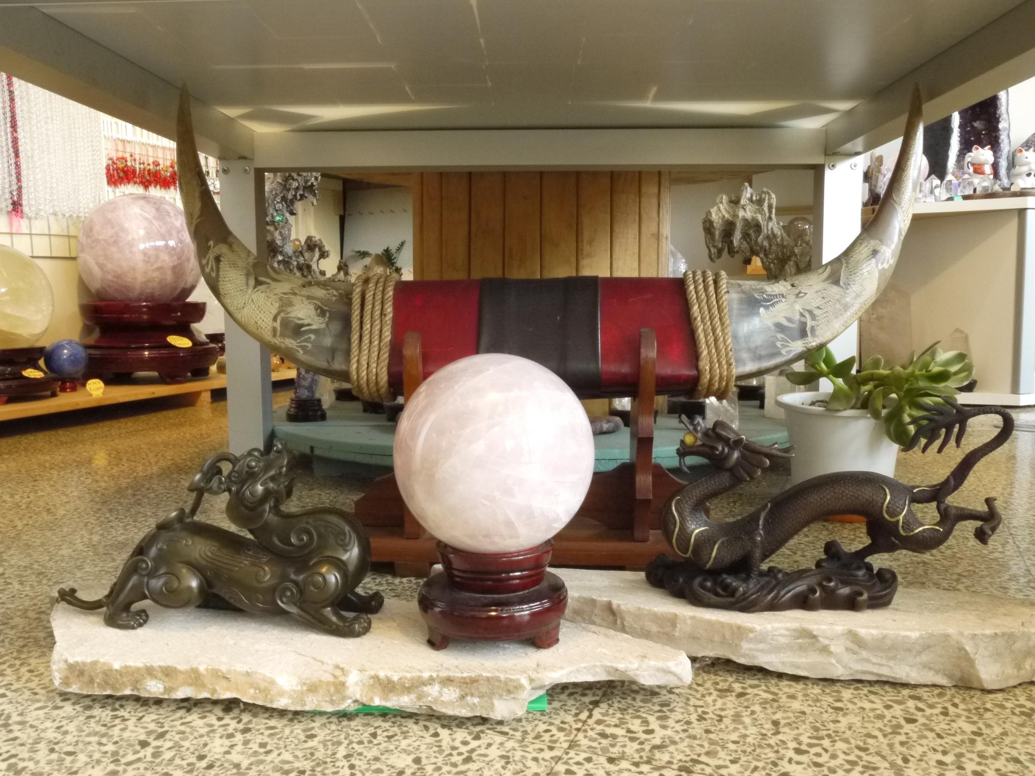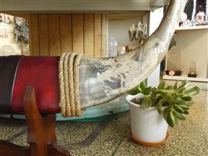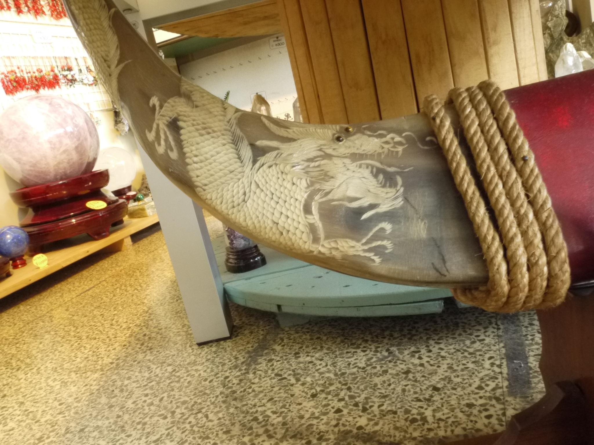 牛の角の両端部分に龍の彫刻を施した置物です。