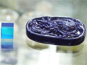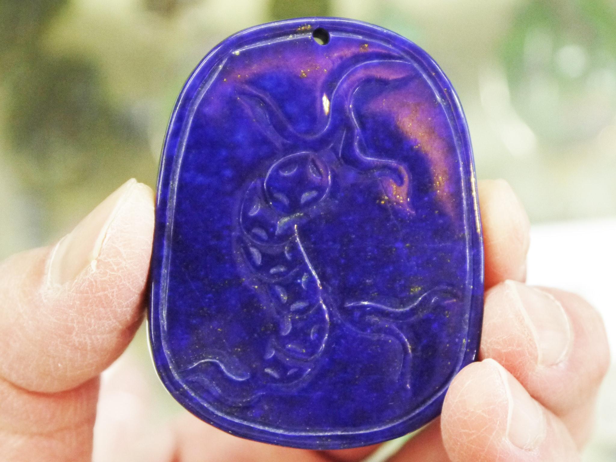 ペンダントトップとしても使うことが出来るように上部に穴が空いています。 青色が青龍としても見れますが、紋章のようにも見えるとても映えるデザインです。