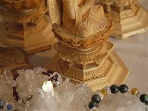 知恵を表す菩薩で、苦難と災難をさけ、平安を招くといわれる菩薩。 中国技術彫刻の名工によって入念精巧に彫られた美しい木像です。