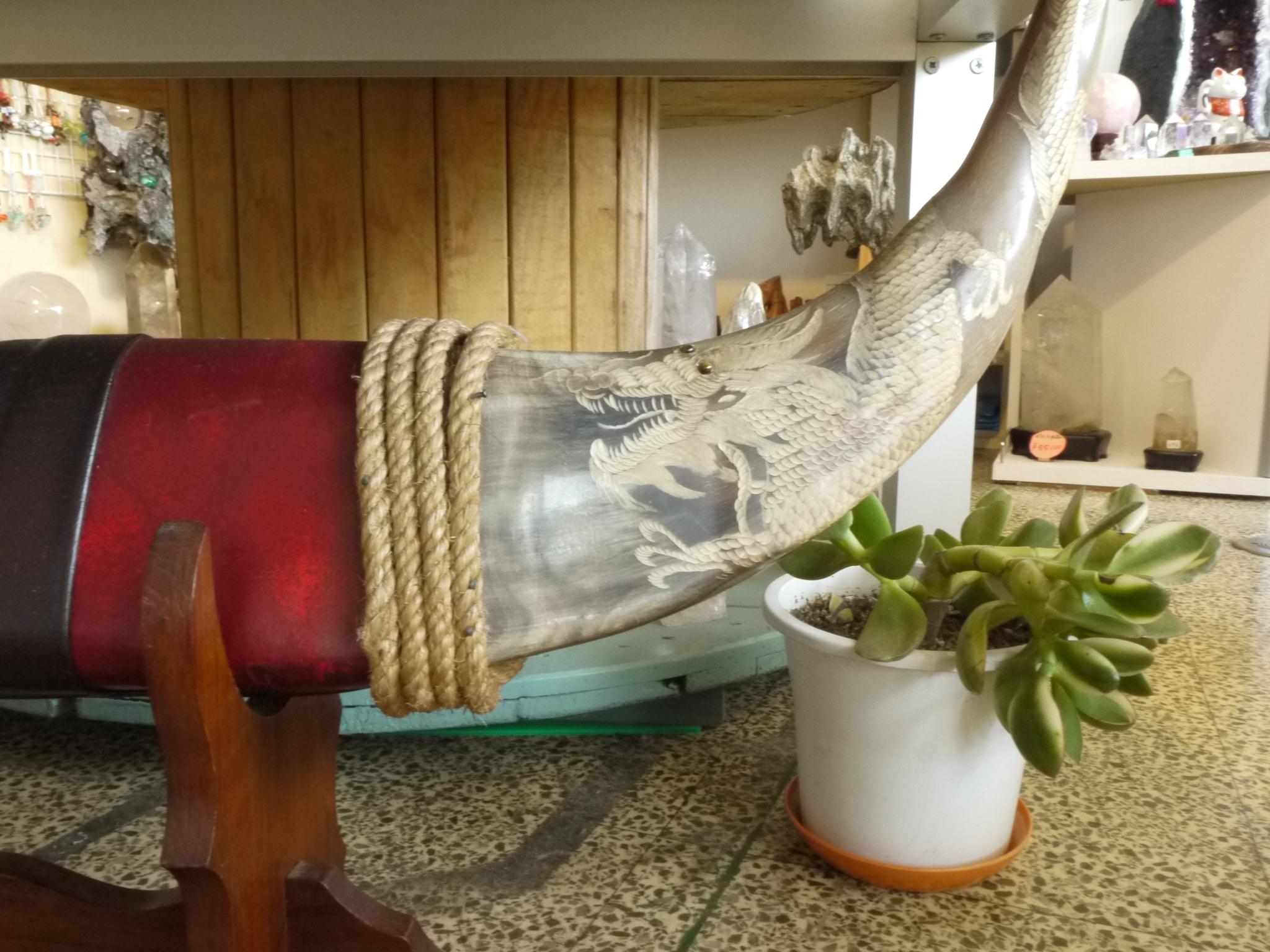 牛の角の両端部分に龍の彫刻を施した置物です。
