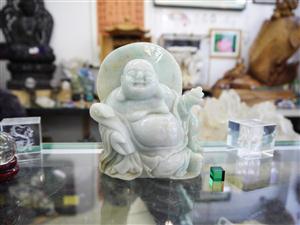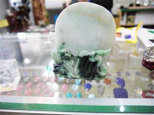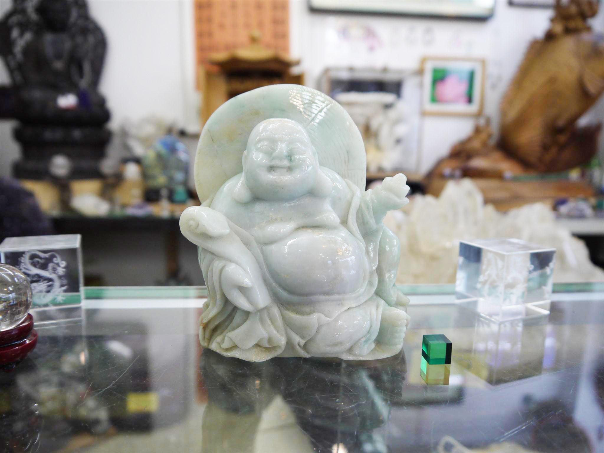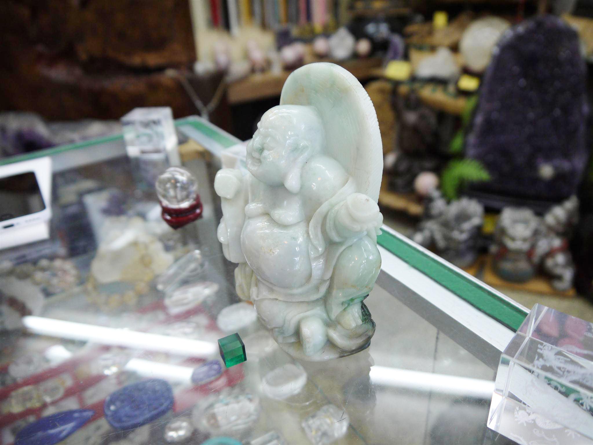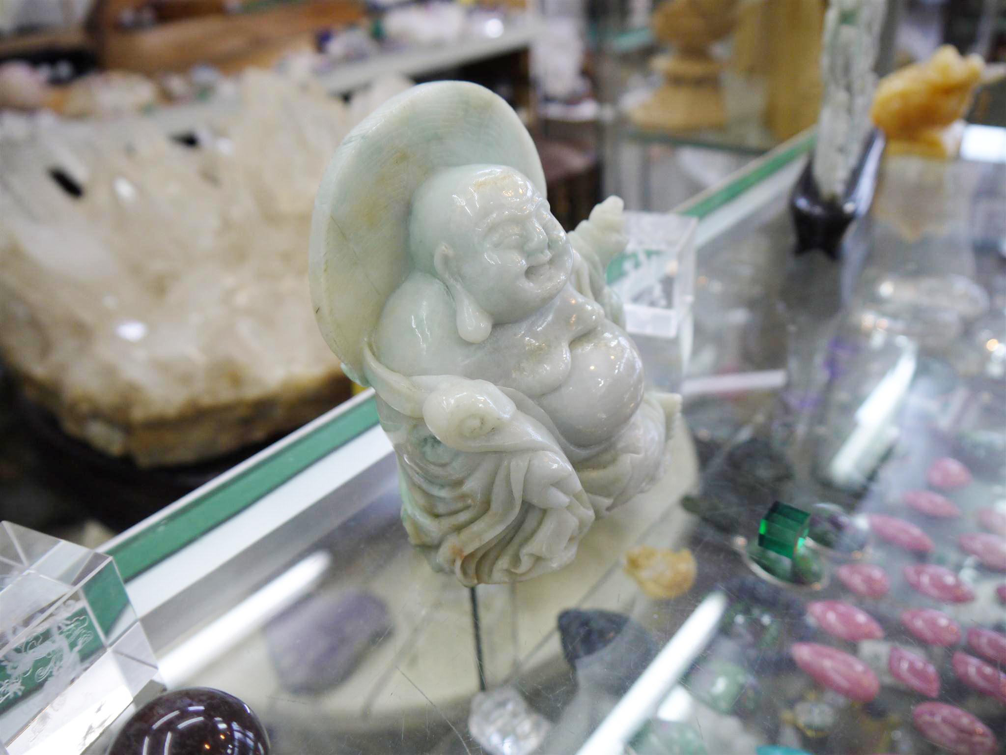 翡翠に彫られた七福神の置物です。 一番目に留まるのが、印象に残るほどにこやかな顔のお顔です。 ここまで笑っている神様はあまり見かけないと思います。