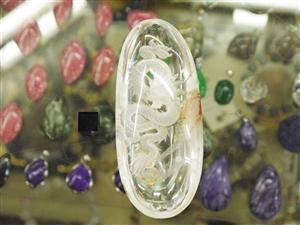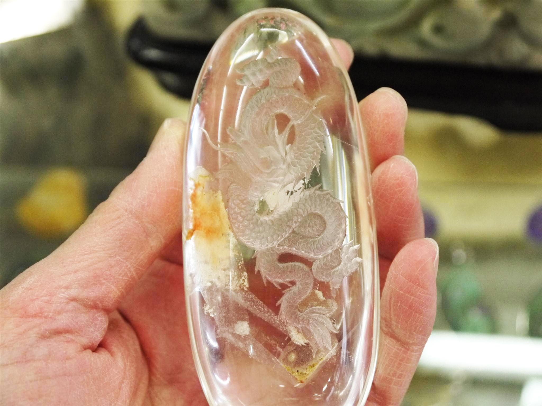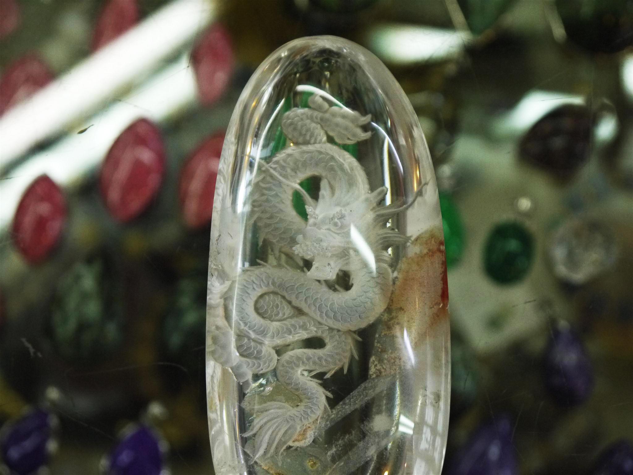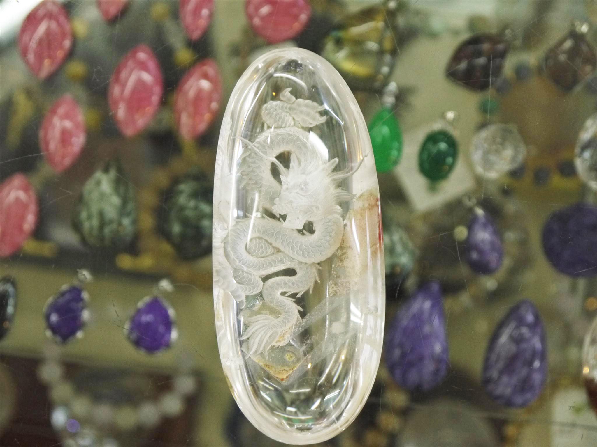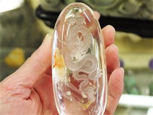 細長い楕円形のガーデン水晶を使用して龍が彫られています。