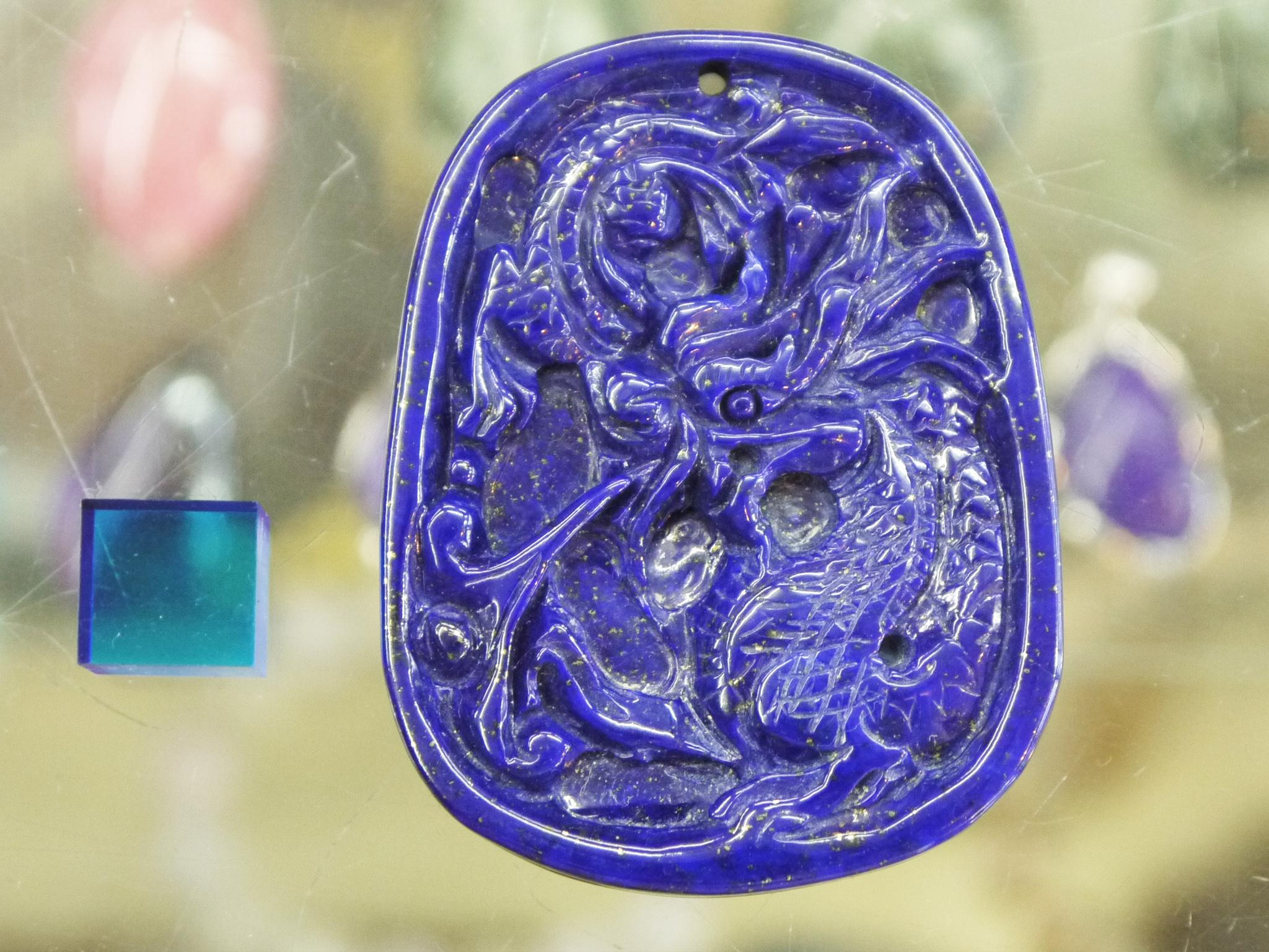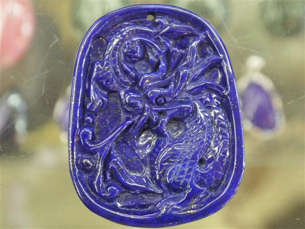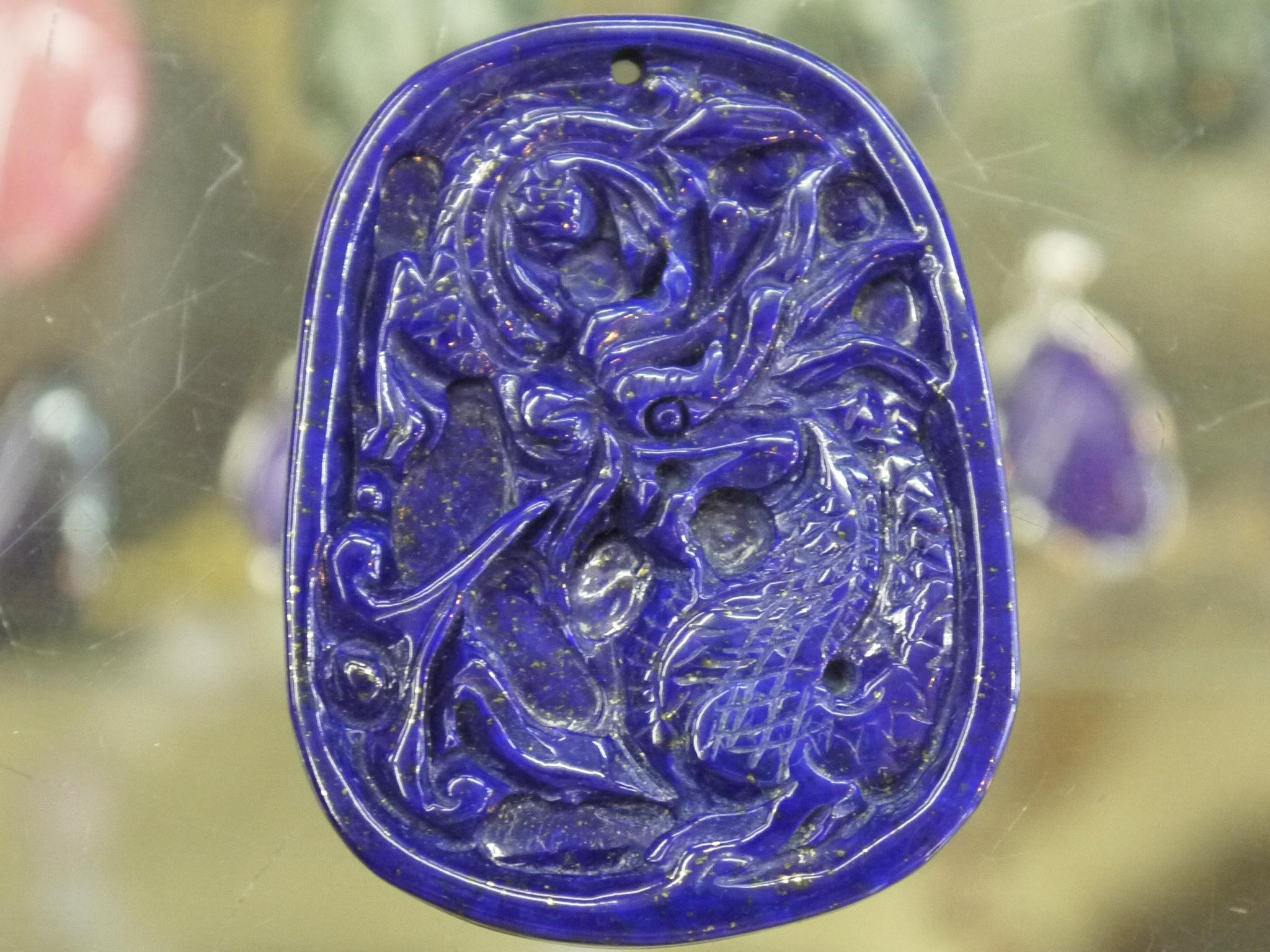 ペンダントトップとしても使うことが出来るように上部に穴が空いています。 青色が青龍としても見れますが、紋章のようにも見えるとても映えるデザインです。