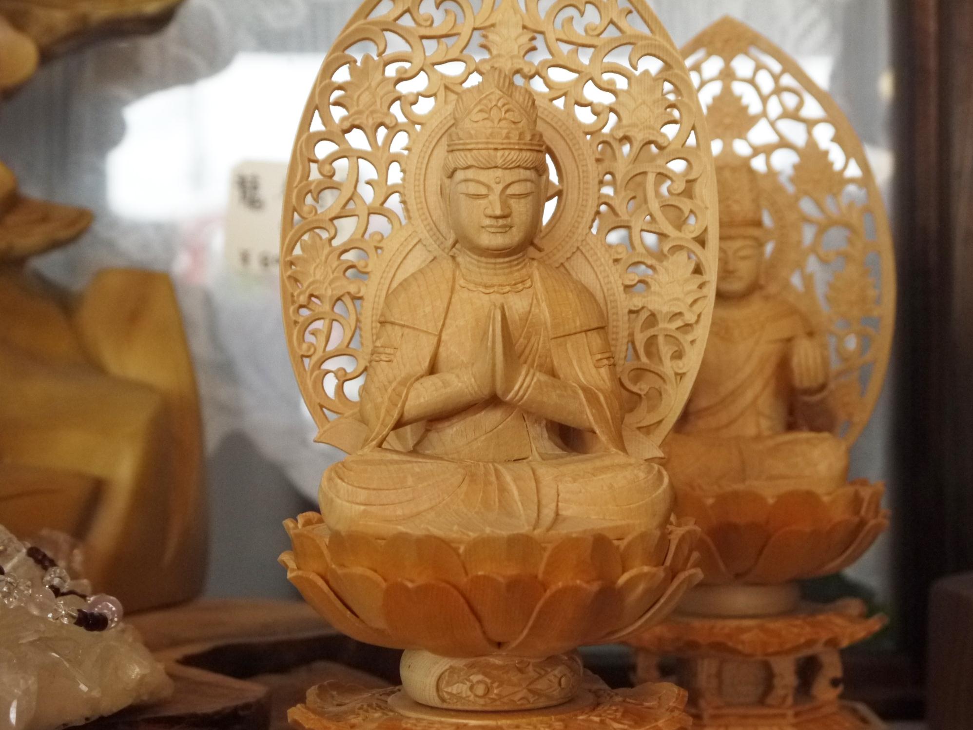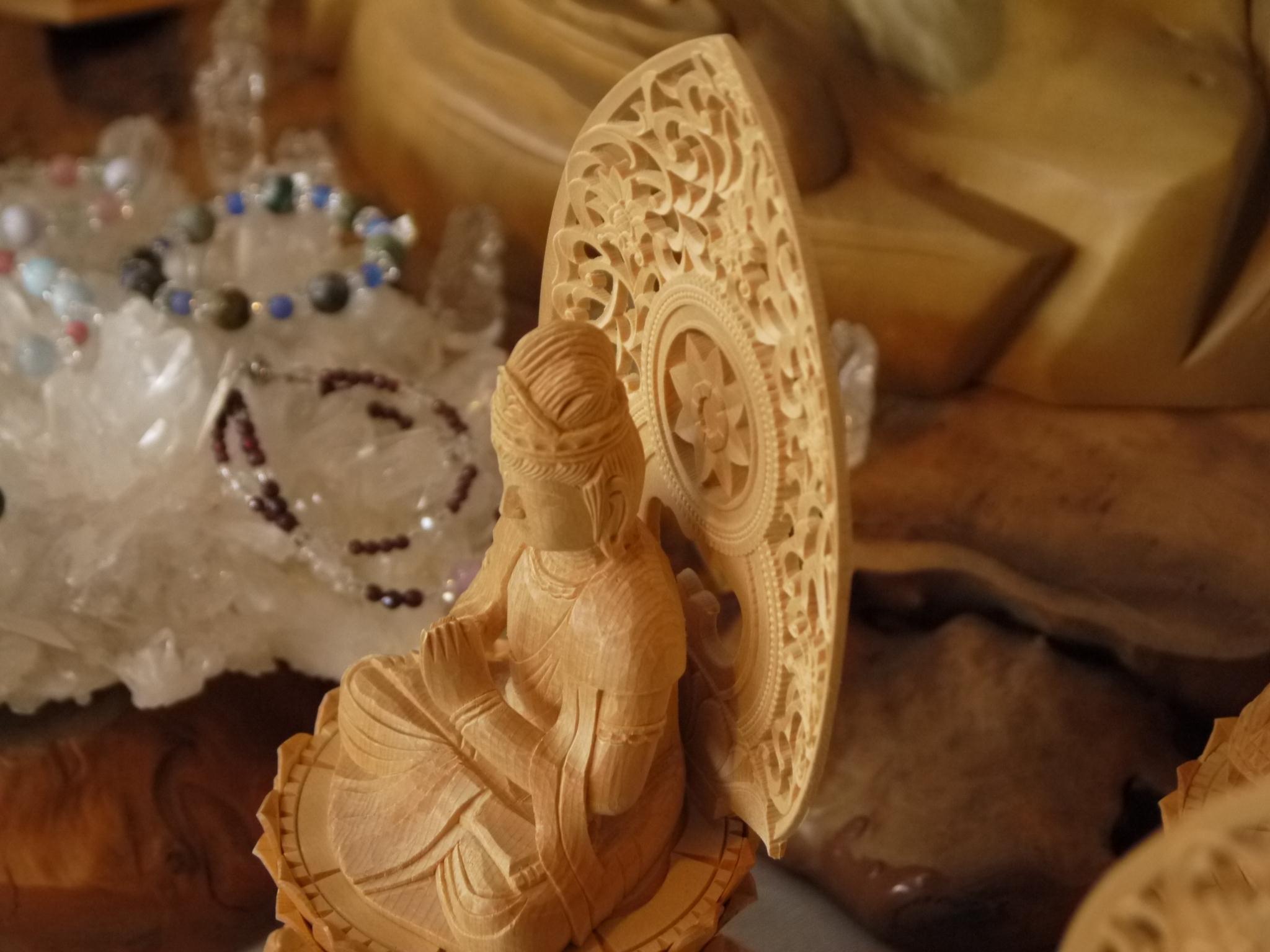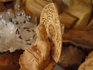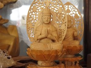 知恵を表す菩薩で、苦難と災難をさけ、平安を招くといわれる菩薩。 中国技術彫刻の名工によって入念精巧に彫られた美しい木像です。