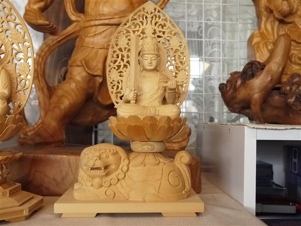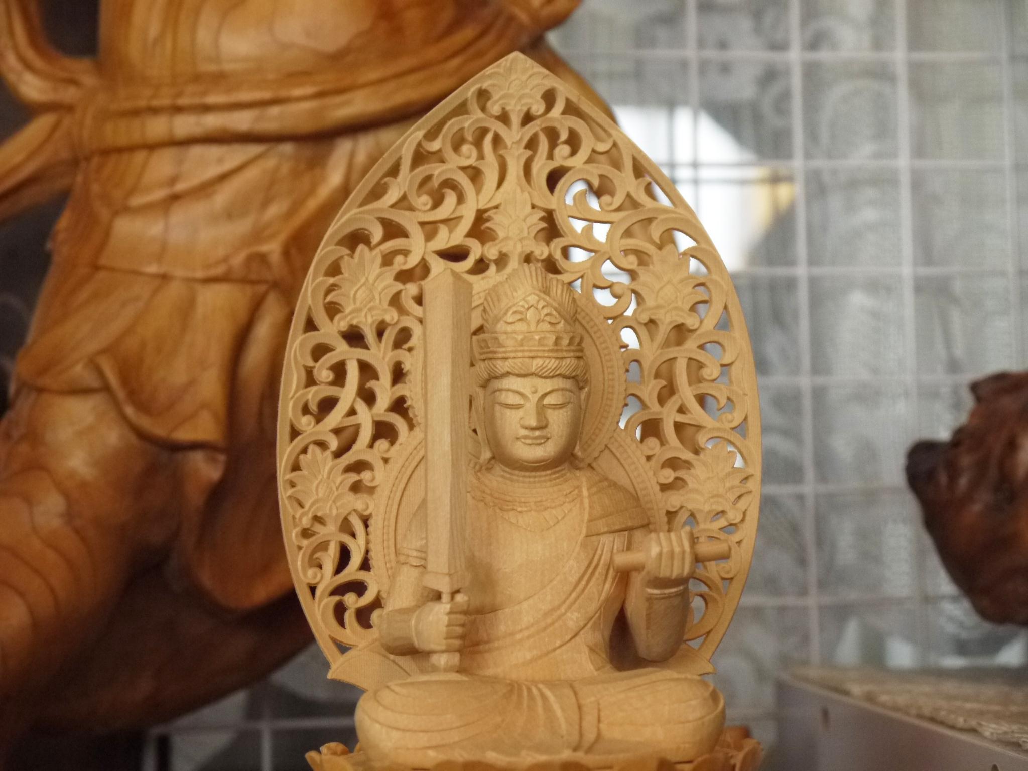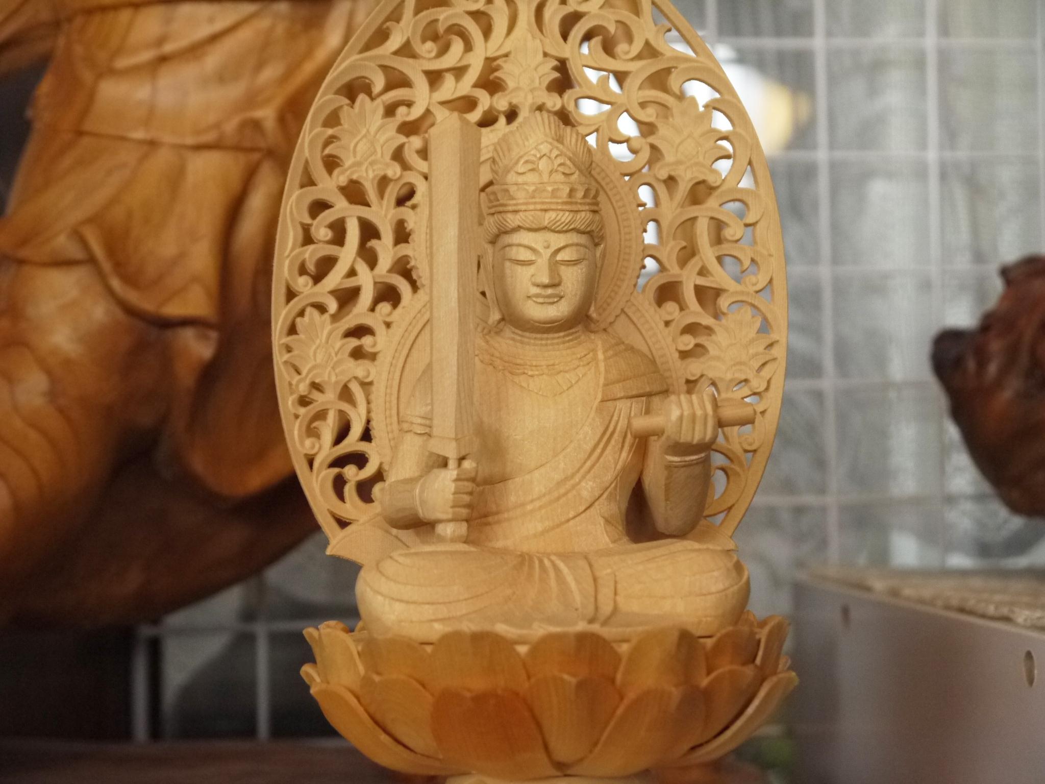 苦労や災難、疫病を断ち切り、無辺の英知を授けてくれると言われる菩薩 中国技術彫刻の名工によって入念精巧に彫られた美しい木像です。